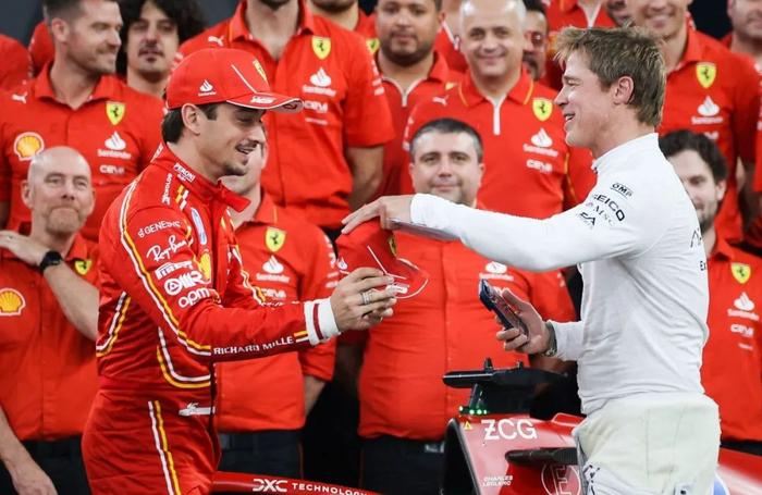 而且得益于老汉的“刷脸”,大量现役F1车手和领队都真人客串了电影(有周冠宇的名字,但似乎没看到正脸?),特别是老汉在法拉利的队友勒克莱尔,还有好几句台词——虽然他NG了很多次,而电影当中的赛车解说,也是F1官方赛车解说。