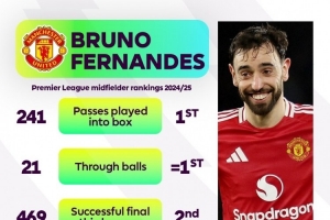 体育资讯3月31日讯 英超官方列出了B费本赛季的数据,B费将球传入禁区、直塞次数英超中场球员中最多,创造机会、助攻次数第二多。