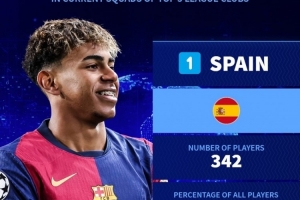 五大联赛各国球员数量排名:西班牙342人最多,法国、德国二三位